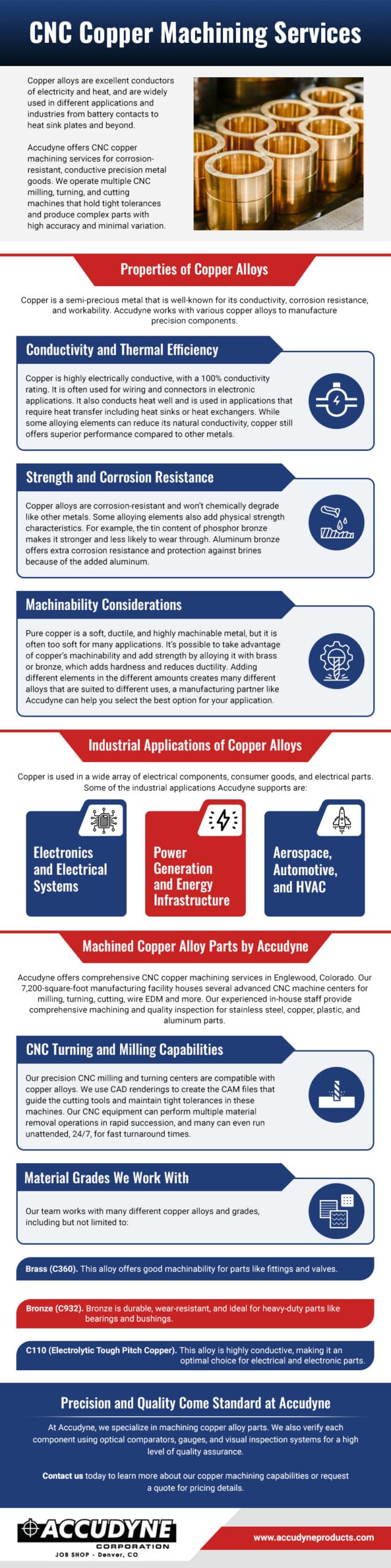 Accudyne offers comprehensive CNC copper machining services in Englewood, Colorado. Our 7,200-square-foot manufacturing facility houses several advanced CNC machine centers for milling, turning, cutting, wire EDM and more. Our experienced in-house staff provide comprehensive machining and quality inspection for stainless steel, copper, plastic, and aluminum parts.